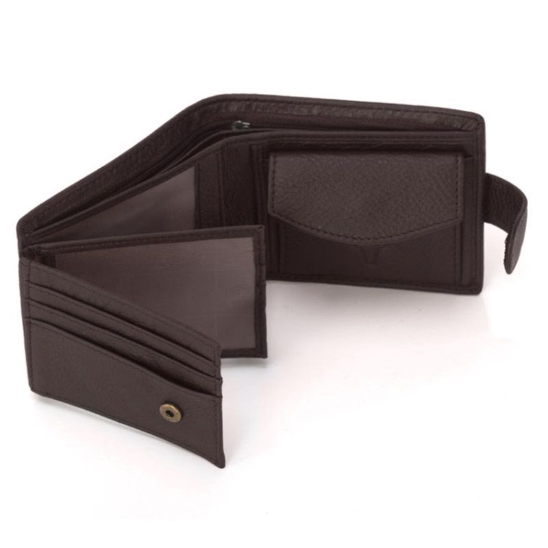 Billetera de cuero natural de alta capacidad con broche. Posee tarjetero y monedero.