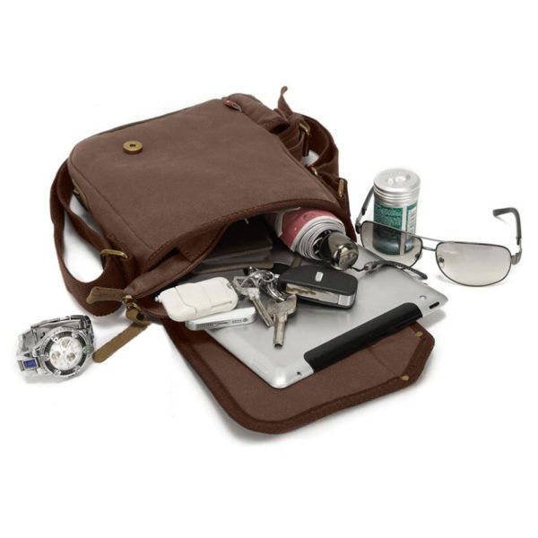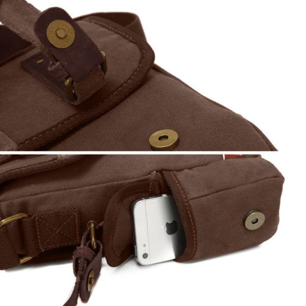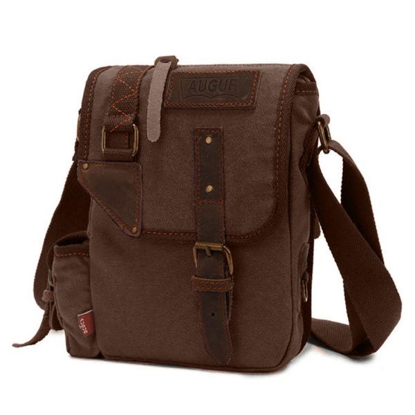 Morral con tapa imantada, cierres y correa regulable. Estilo vintage, de uso urbano y viajero. Ideal para tamaño A5 y tablet de 10 pulgadas.